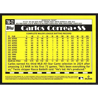This is a 2025 Topps '90 Carlos Correa baseball card. The card is #T90-72 and pictures show condition.