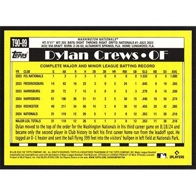 This is a 2025 Topps '90 Dylan Crews baseball card. The card is #T90-89 and pictures show condition. Team(s): Washington Nationals Rookie Card (RC)