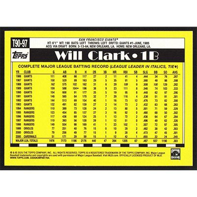 This is a 2025 Topps '90 Will Clark baseball card. The card is #T90-97 and pictures show condition.
