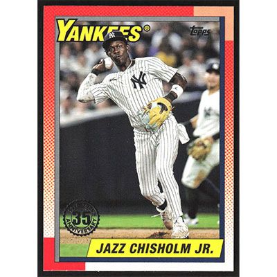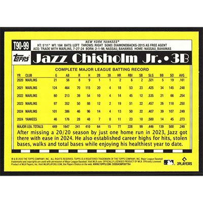 This is a 2025 Topps '90 Jazz Chisholm Jr. baseball card. The card is #T90-99 and pictures show condition.