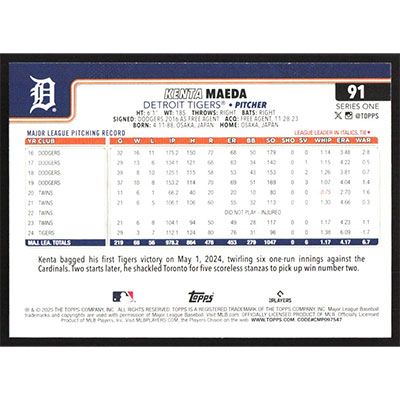 This is a 2025 Topps Kenta Maeda baseball card. The card is #91 and pictures show condition.