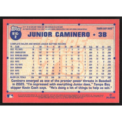 This is a 2025 Topps '91 Silver Pack Chrome Junior Caminero baseball card. The card is #91C-2 and pictures show condition.