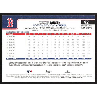 This is a 2025 Topps Danny Jansen baseball card. The card is #92 and pictures show condition.