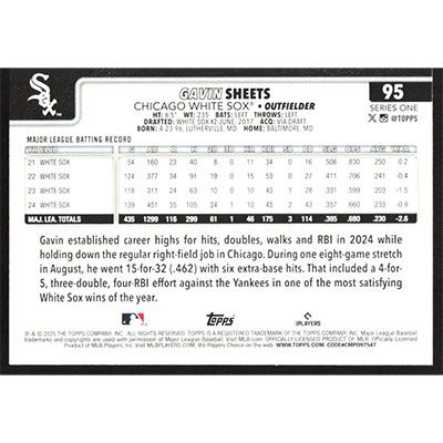This is a 2025 Topps Gavin Sheets baseball card. The card is #95 and pictures show condition.