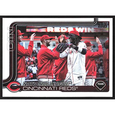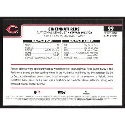 This is a 2025 Topps Cincinnati Reds Team Card baseball card. The card is #99 and pictures show condition.
