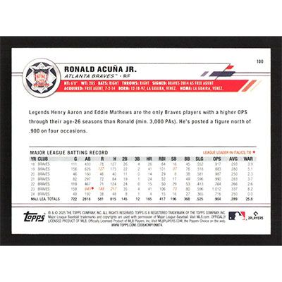 This is a 2025 Topps All-Star Game Ronald Acuña Jr. baseball card. The card is #100 and pictures show condition.