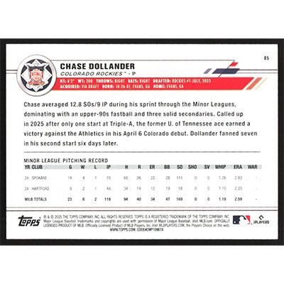 This is a 2025 Topps All-Star Game Chase Dollander baseball card. The card is #85 and pictures show condition. Team(s): Colorado Rockies Rookie Card (RC)