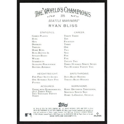 This is a 2025 Topps Allen & Ginter Ryan Bliss baseball card. The card is #205 and pictures show condition. Team(s): Seattle Mariners Rookie Card (RC)