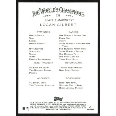 This is a 2025 Topps Allen & Ginter Logan Gilbert baseball card. The card is #239 and pictures show condition.
