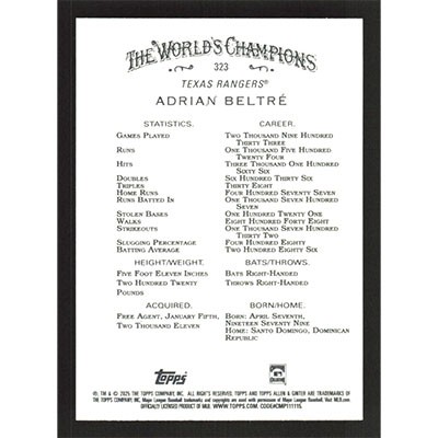 This is a 2025 Topps Allen & Ginter Adrian Beltre short print baseball card. The card is #323 and pictures show condition.