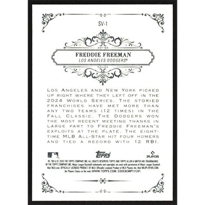 This is a 2025 Topps Allen & Ginter Sweet Victory Freddie Freeman baseball card. The card is #SV-1 and pictures show condition. Team(s): Los Angeles Dodgers