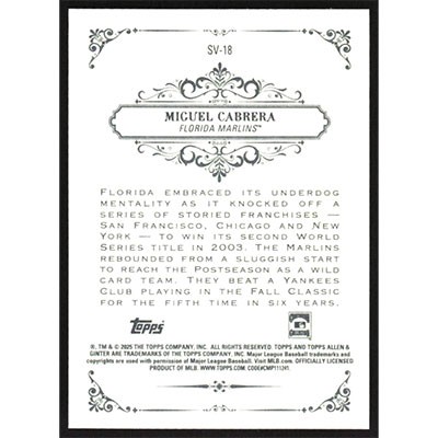 This is a 2025 Topps Allen & Ginter Sweet Victory Miguel Cabrera baseball card. The card is #SV-18 and pictures show condition.