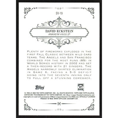 This is a 2025 Topps Allen & Ginter Sweet Victory David Eckstein baseball card. The card is #SV-19 and pictures show condition.