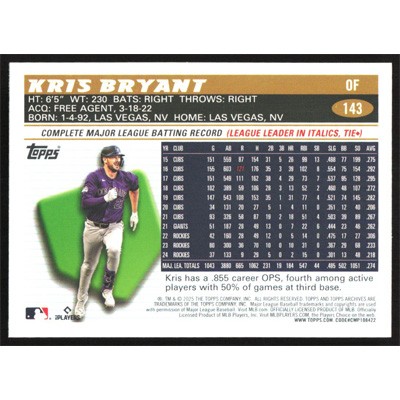 This is a 2025 Topps Archives Kris Bryant baseball card. The card is #143 and pictures show condition.