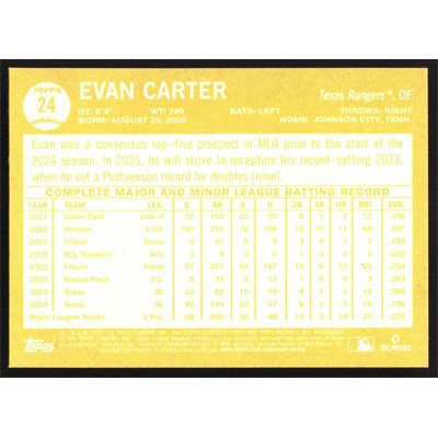 This is a 2025 Topps Archives Evan Carter baseball card. The card is #24 and pictures show condition.