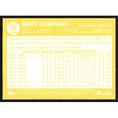 This is a 2025 Topps Archives Matt Chapman baseball card. The card is #55 and pictures show condition.