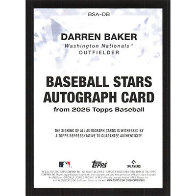 This is a 2025 Topps Baseball Stars Autographs Darren Baker autographed baseball card. This card has been signed, in blue, by Darren Baker, and is certified authentic by Topps. The card is #BSA-DB and pictures show condition.