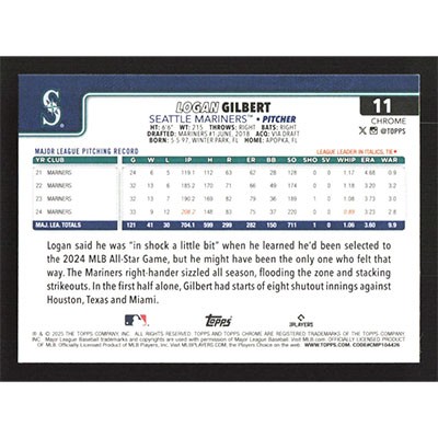 This is a 2025 Topps Chrome Logan Gilbert baseball card. The card is #11 and pictures show condition.