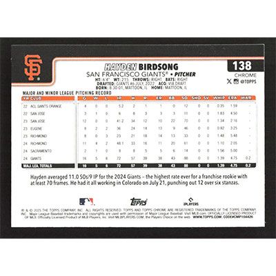 This is a 2025 Topps Chrome Hayden Birdsong baseball card. The card is #138 and pictures show condition. Team(s): San Francisco Giants Rookie Card (RC)