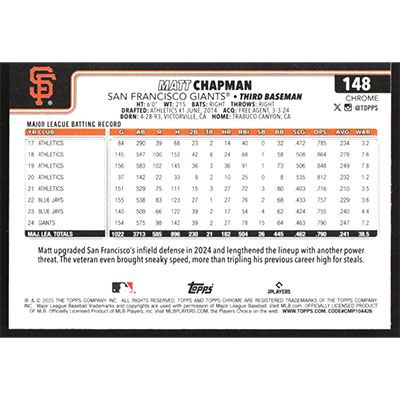 This is a 2025 Topps Chrome Matt Chapman baseball card. The card is #148 and pictures show condition.
