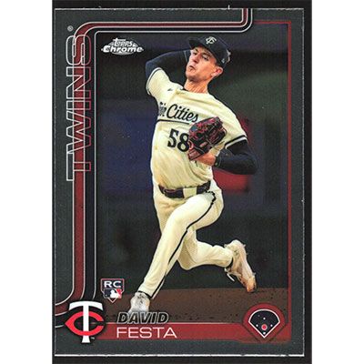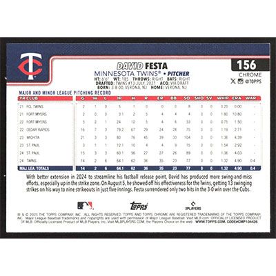This is a 2025 Topps Chrome David Festa baseball card. The card is #156 and pictures show condition.