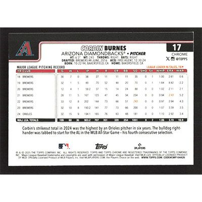 This is a 2025 Topps Chrome Corbin Burnes baseball card. The card is #17 and pictures show condition.