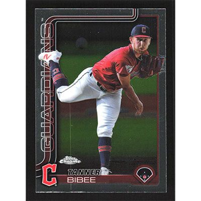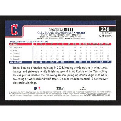 This is a 2025 Topps Chrome Tanner Bibee baseball card. The card is #236 and pictures show condition.