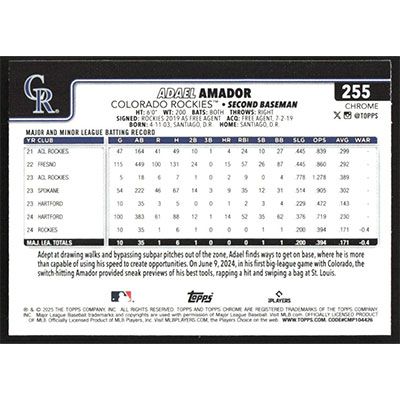 This is a 2025 Topps Chrome Adael Amador baseball card. The card is #255 and pictures show condition.