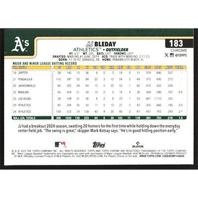 This is a 2025 Topps Chrome RayWave Refractors JJ Bleday baseball card. The card is #183 and pictures show condition.