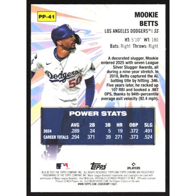 This is a 2025 Topps Chrome Update Power Players Mookie Betts baseball card. The card is #PP-41 and pictures show condition. Team(s): Los Angeles Dodgers