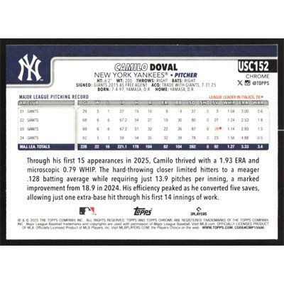 This is a 2025 Topps Chrome Update RayWave Refractors Camilo Doval baseball card. The card is #USC152 and pictures show condition.