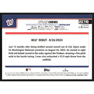 This is a 2025 Topps Chrome Update RayWave Refractors Dylan Crews Rookie Debut baseball card. The card is #USC190 and pictures show condition. Team(s): Washington Nationals Rookie Card (RC)