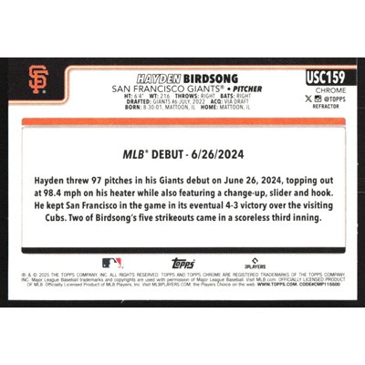 This is a 2025 Topps Chrome Update Refractors Hayden Birdsong Rookie Debut baseball card. The card is #USC159 and pictures show condition. Team(s): San Francisco Giants Rookie Card (RC)