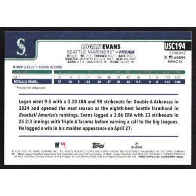 This is a 2025 Topps Chrome Update Refractors Logan Evans baseball card. The card is #USC194 and pictures show condition. Team(s): Seattle Mariners Rookie Card (RC)