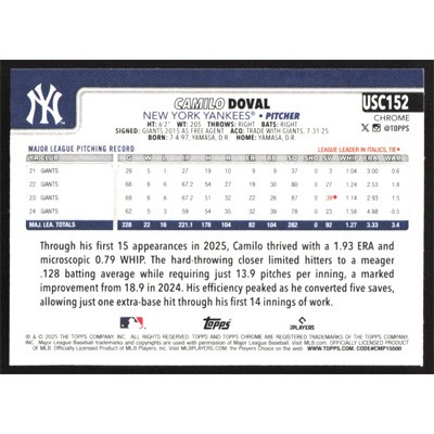 This is a 2025 Topps Chrome Update Sepia Refractors Camilo Doval baseball card. The card is #USC152 and pictures show condition.