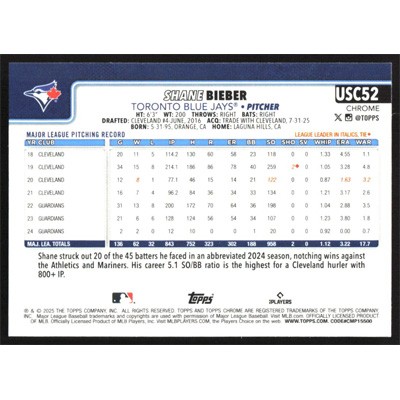 This is a 2025 Topps Chrome Update Sepia Refractors Shane Bieber baseball card. The card is #USC52 and pictures show condition.