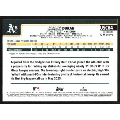 This is a 2025 Topps Chrome Update Sepia Refractors Carlos Duran baseball card. The card is #USC84 and pictures show condition. Team(s): Athletics Rookie Card (RC)