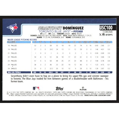This is a 2025 Topps Chrome Update Seranthony Dominguez baseball card. The card is #USC100 and pictures show condition.