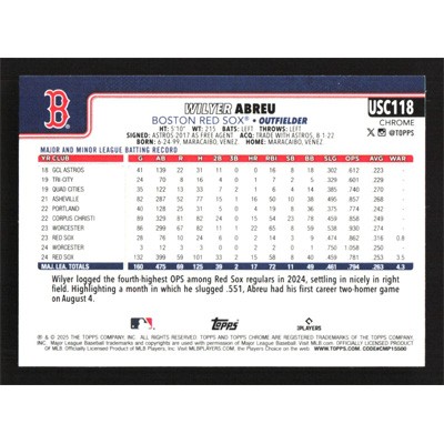 This is a 2025 Topps Chrome Update Wilyer Abreu baseball card. The card is #USC118 and pictures show condition.
