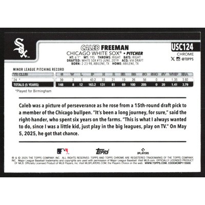 This is a 2025 Topps Chrome Update Caleb Freeman baseball card. The card is #USC124 and pictures show condition. Team(s): Chicago White Sox Rookie Card (RC)