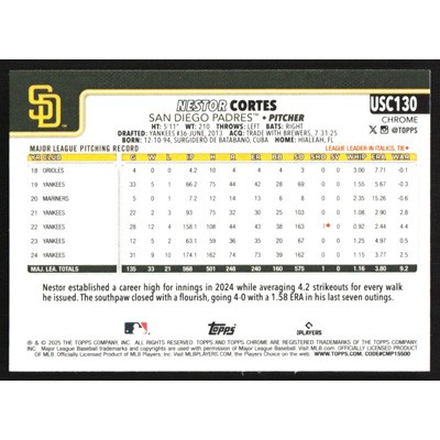 This is a 2025 Topps Chrome Update Nestor Cortes baseball card. The card is #USC130 and pictures show condition.