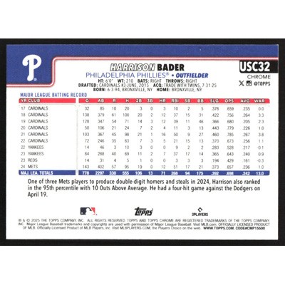 This is a 2025 Topps Chrome Update Harrison Bader baseball card. The card is #USC32 and pictures show condition.