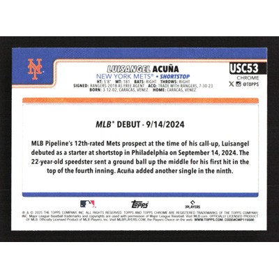 This is a 2025 Topps Chrome Update Luisangel Acuña Rookie Debut baseball card. The card is #USC53 and pictures show condition. Team(s): New York Mets Rookie Card (RC)