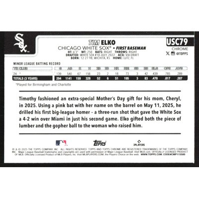 This is a 2025 Topps Chrome Update Tim Elko baseball card. The card is #USC79 and pictures show condition. Team(s): Chicago White Sox Rookie Card (RC)