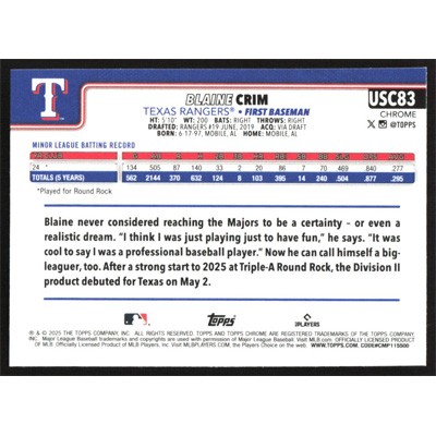 This is a 2025 Topps Chrome Update Blaine Crim baseball card. The card is #USC83 and pictures show condition.
