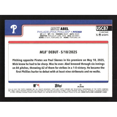 This is a 2025 Topps Chrome Update Mick Abel Rookie Debut baseball card. The card is #USC87 and pictures show condition. Team(s): Philadelphia Phillies Rookie Card (RC)