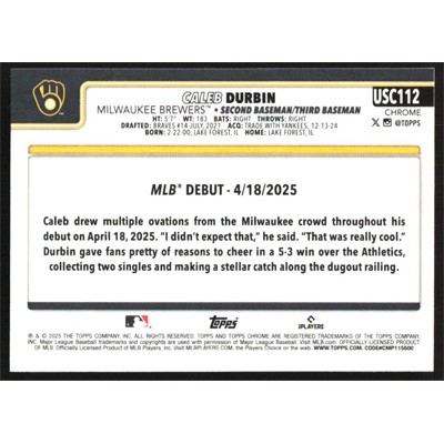 This is a 2025 Topps Chrome Update X-Fractors Caleb Durbin Rookie Debut baseball card. The card is #USC112 and pictures show condition.