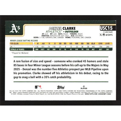 This is a 2025 Topps Chrome Update X-Fractors Denzel Clarke baseball card. The card is #USC15 and pictures show condition.