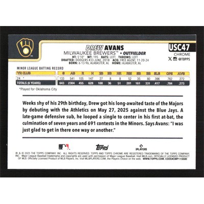 This is a 2025 Topps Chrome Update X-Fractors Drew Avans baseball card. The card is #USC47 and pictures show condition.