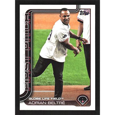 This is a 2025 Topps First Pitch Adrian Beltre baseball card. The card is #FP-8 and pictures show condition.
